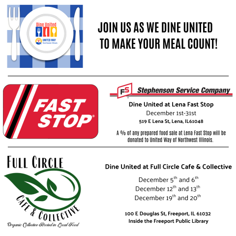 Dine United is a community fundraising event where participating restaurants donate a portion of their proceeds from a select day or days to United Way of Northwest Illinois. Proceeds go directly…